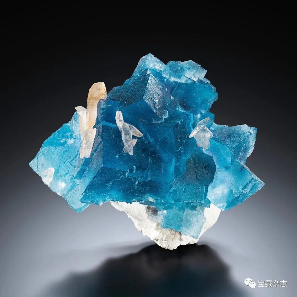天藍色立方體螢石聚合體上點綴了幾叢無色或淡黃色的透明方解石,該螢石因釔元素致色。