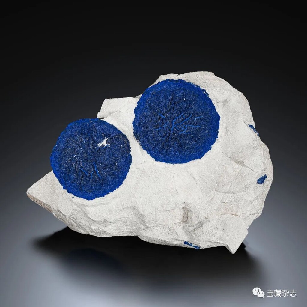 深藍色藍銅礦小晶體組成的獨特圓形集合體,圍岩為白色的高嶺土。