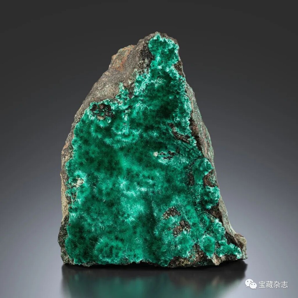 孔雀石是一種碳酸鹽礦物,顏色淺綠色到深綠色,絲絹光澤的綠色鐘乳狀孔雀石集合體,絲絹光澤主要是由纖維狀的孔雀石晶體反射出的光線所致。可以製成首飾和雕件,俄羅斯人把孔雀石當做建築物內部的裝飾材料,因為有鮮豔的綠色和精美的花紋,深受喜歡。孔雀石比較脆,韌度偏弱,產量大,因此價值一般。但造型獨特、塊度較大的孔雀石常常被製作成較高價值的觀賞石。顏色好的孔雀石粉末可以作為高級顏料使用。
