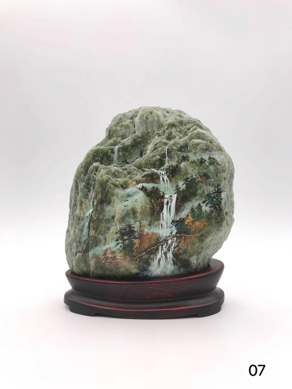 此作係由書畫家林正義於台灣玉揮灑創作,利用原石本身的條件底色,賦予作品新的生命。雁渡群山,飛向未知。