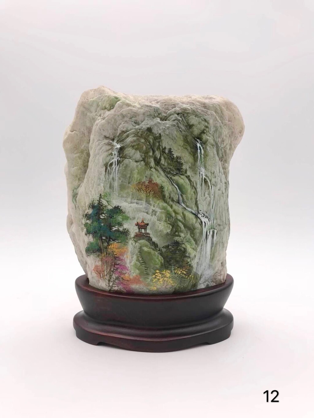 此作係由書畫家林正義於台灣玉揮灑創作,利用原石本身的條件底色,賦予作品新的生命。松林掩映,桃花盛開,令人發思古之幽情。