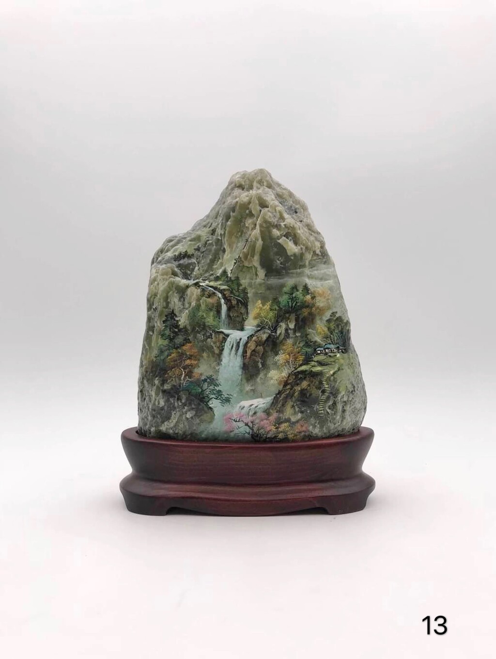 此作係由書畫家林正義於台灣玉揮灑創作,利用原石本身的條件底色,賦予作品新的生命。台灣玉紋理分明,連綿高山矗然鼎立。