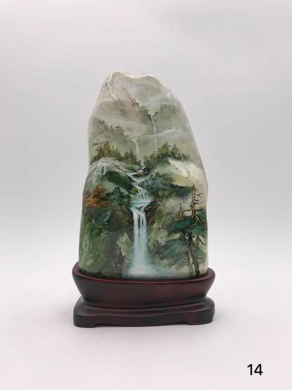 此作係由書畫家林正義於台灣玉揮灑創作,利用原石本身的條件底色,賦予作品新的生命。青松如蓋,山泉清冽流於泉上,欲訪乎?