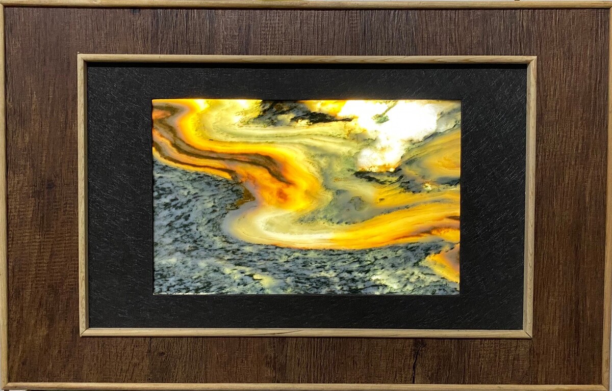 龍雲石因地質構造簡單明晰,石英質與石灰質相互滲透,乳白、酪黃、墨青等,幻化出渾然天成的圖案,線條優美,石色樸質,形構成山巒層疊、波光盪漾的景象。將龍雲石薄化至0.5-0.8公分,安上光源,大自然的神妙與不思議將呈現在你眼前。