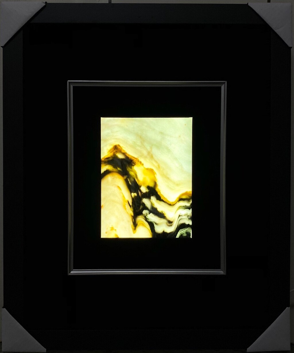 龍雲石因地質構造簡單明晰,石英質與石灰質相互滲透,乳白、酪黃、墨青等,幻化出渾然天成的圖案,線條優美,石色樸質,形構成山巒層疊、波光盪漾的景象。將龍雲石薄化至0.5-0.8公分,安上光源,大自然的神妙與不思議將呈現在你眼前。