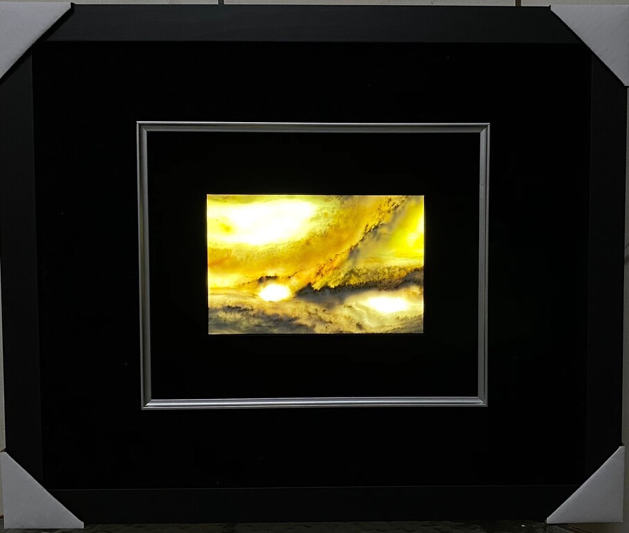 龍雲石因地質構造簡單明晰,石英質與石灰質相互滲透,乳白、酪黃、墨青等,幻化出渾然天成的圖案,線條優美,石色樸質,形構成山巒層疊、波光盪漾的景象。將龍雲石薄化至0.5-0.8公分,安上光源,大自然的神妙與不思議將呈現在你眼前。