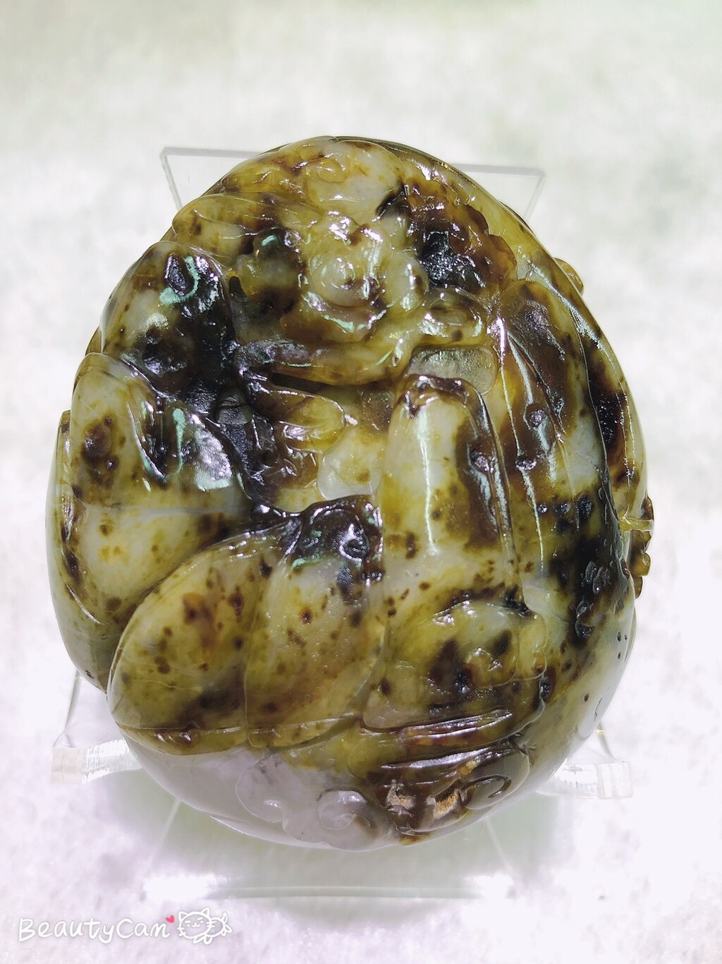 台灣東部產的年糕玉,因似古玉,所以以雕件來呈現更能讓玉質的質感表現出,此件以拆色的方式來表現更能讓年糕玉有差別性的呈現個別的美。