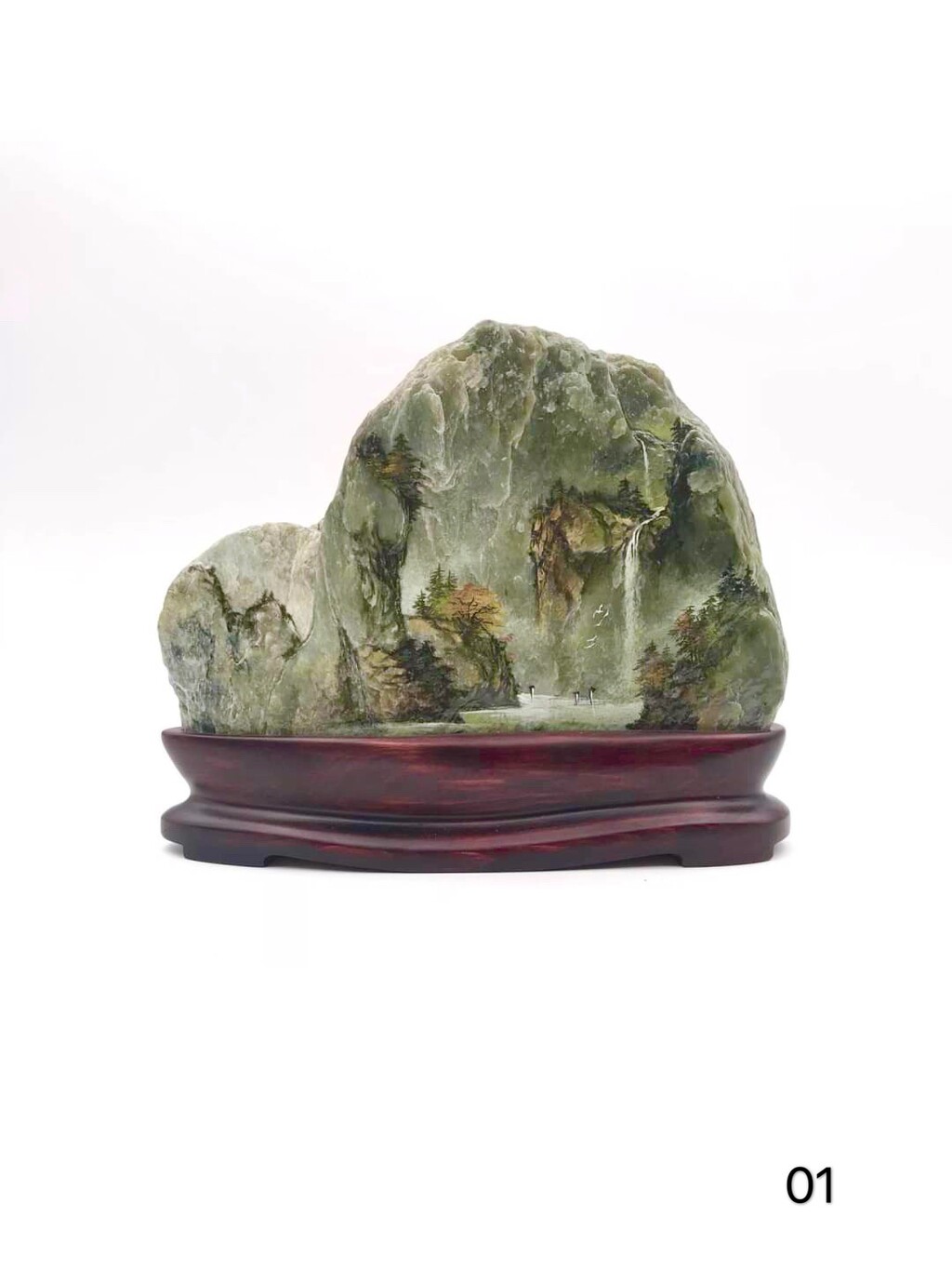 此作係由書畫家林正義於台灣玉揮灑創作,利用原石本身的條件底色,賦予作品新的生命。隱居山中且獨善其身是一定,身處江湖仍清廉自持則實屬不易,面對混濁的世界,願你我依舊保有清明與正義。